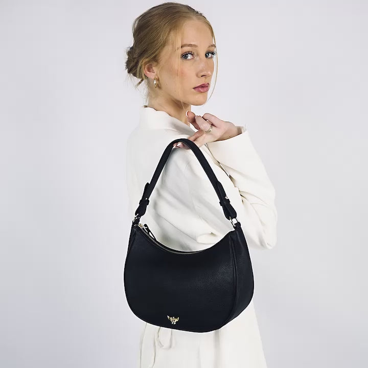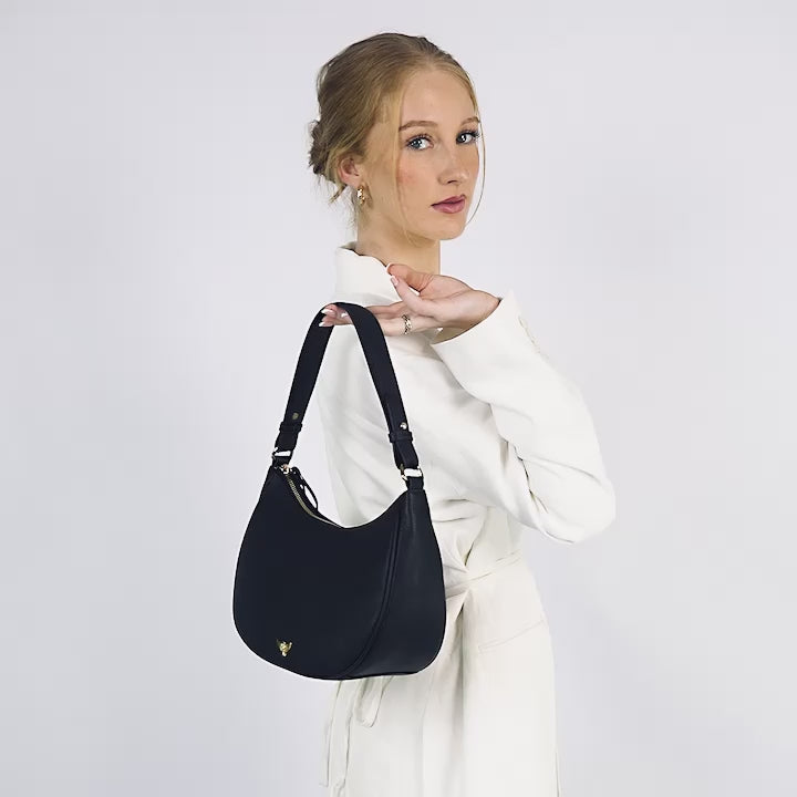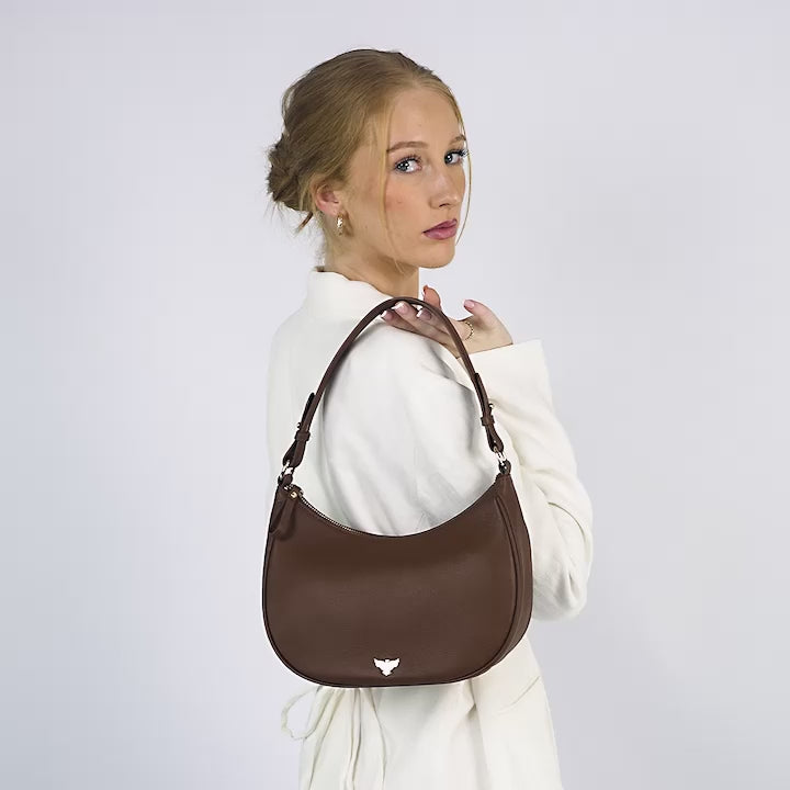 Discover The Lucy Bag, crafted from smooth, luxurious leather and finished with our signature gold hardware. Its graceful crescent shape sits perfectly under your shoulder or in the crook of your arm, blending effortless style with everyday practicality.