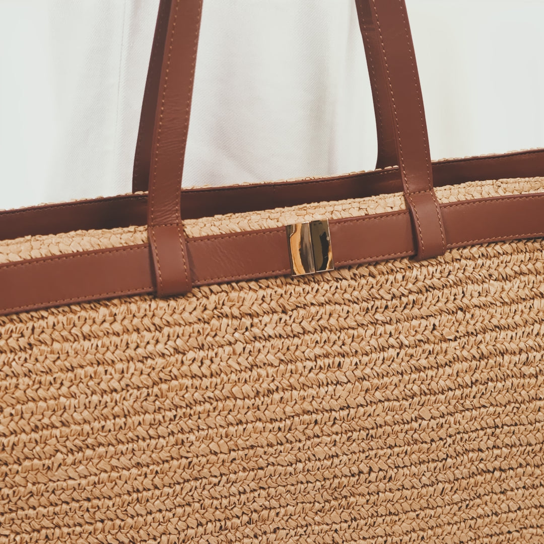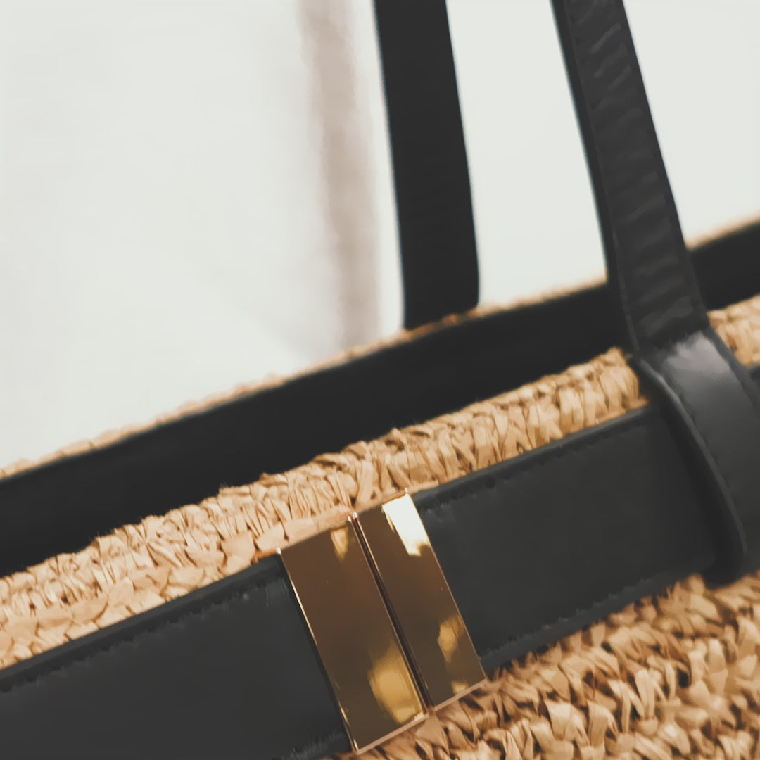 The Esme Raffia Tote Bag with Leather TrimBlack