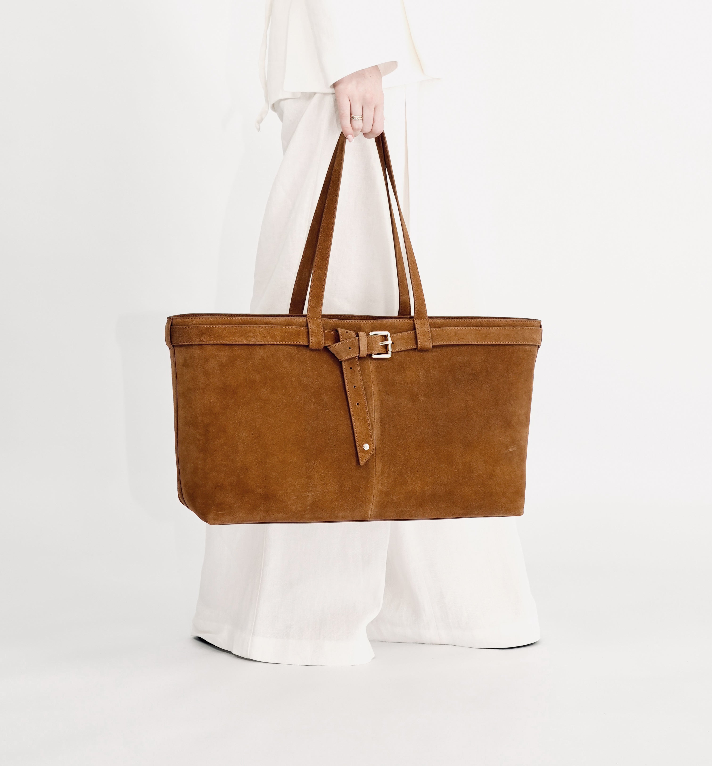 - Premium tan suede bag accented with iconic gold-tone hardware