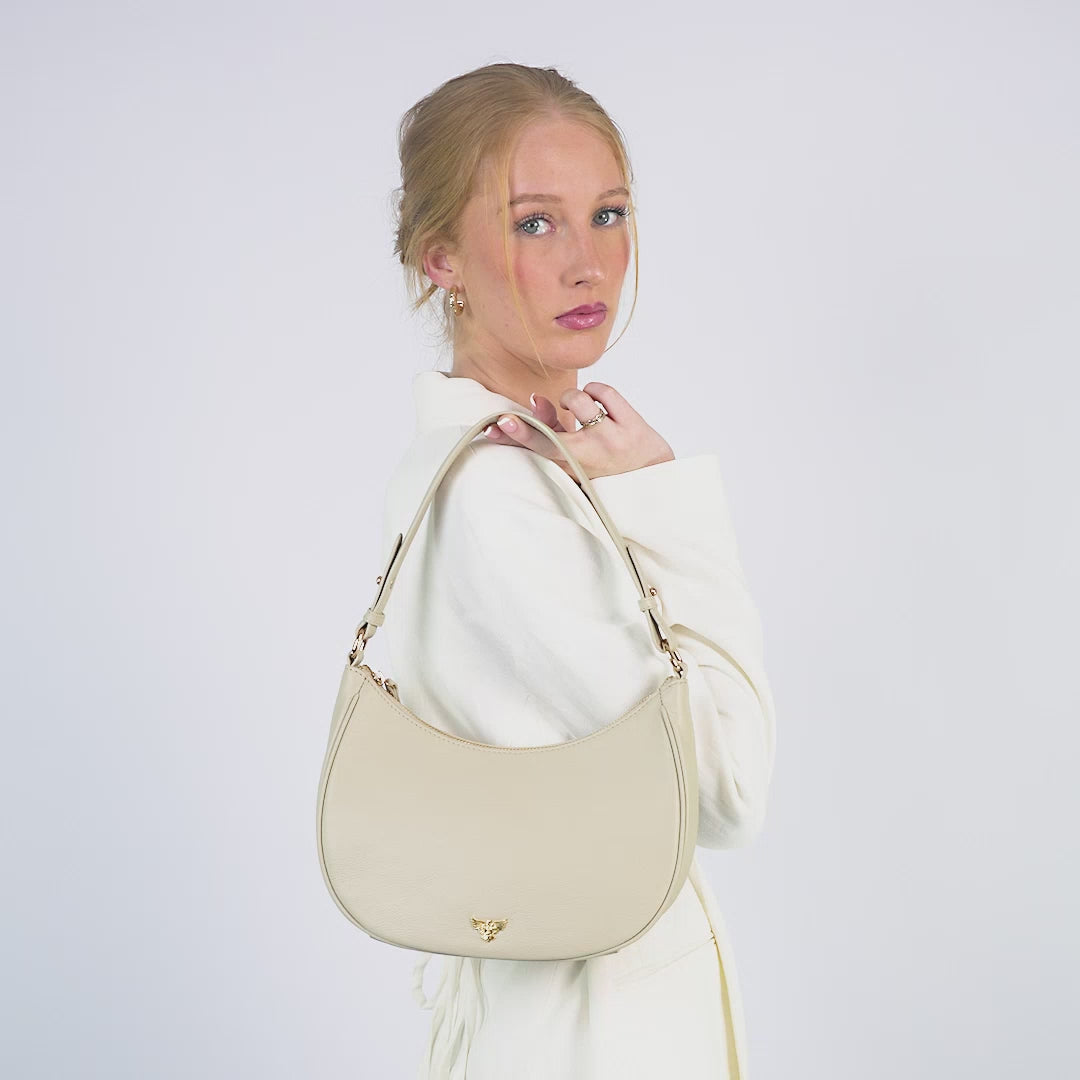 - Timeless crescent shape, ideal under the shoulder or in the crook of the arm