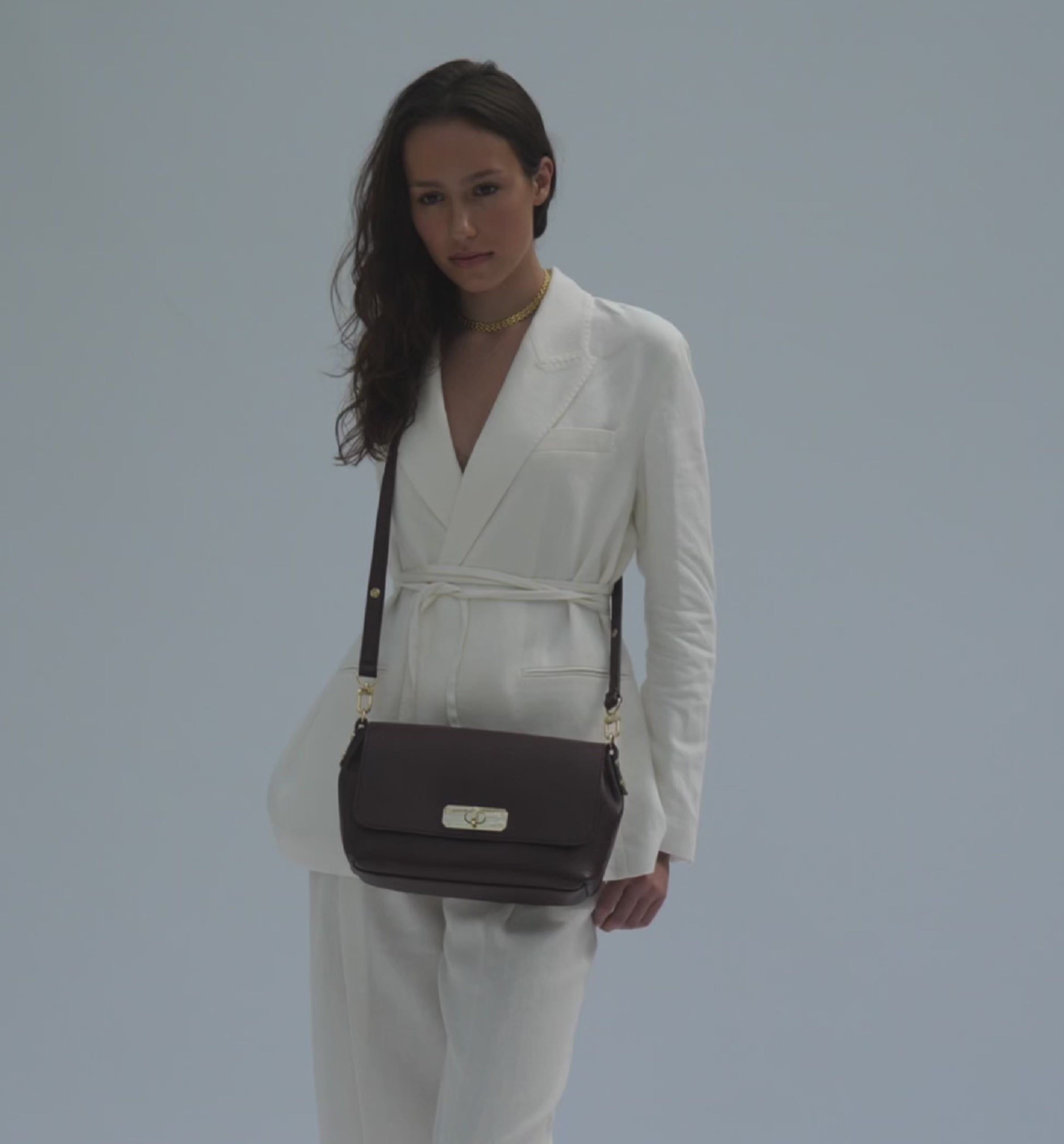 The Maisie Maxi bag in burgundy is made in Italy. 100% leather. Twist lock clasp.