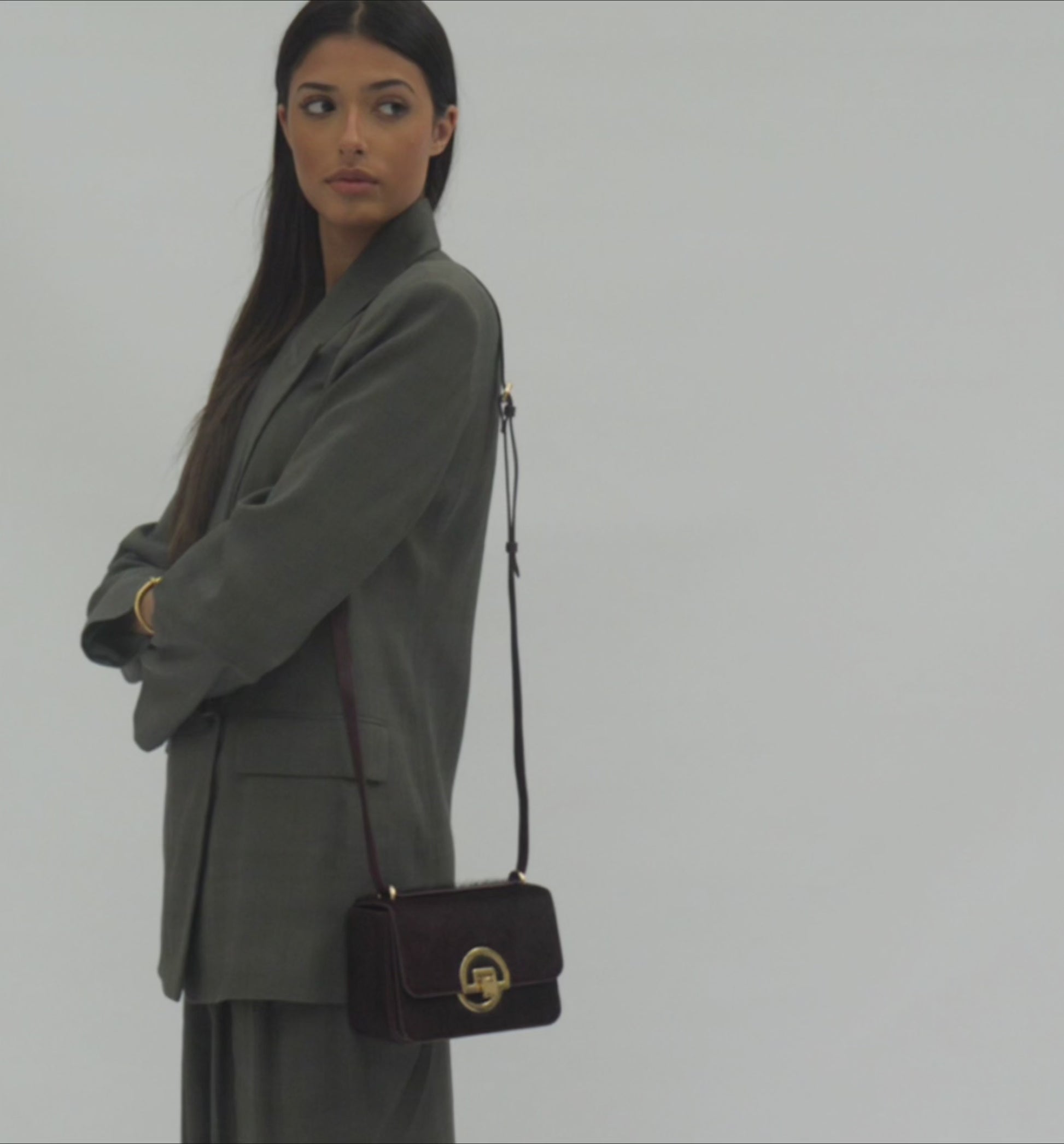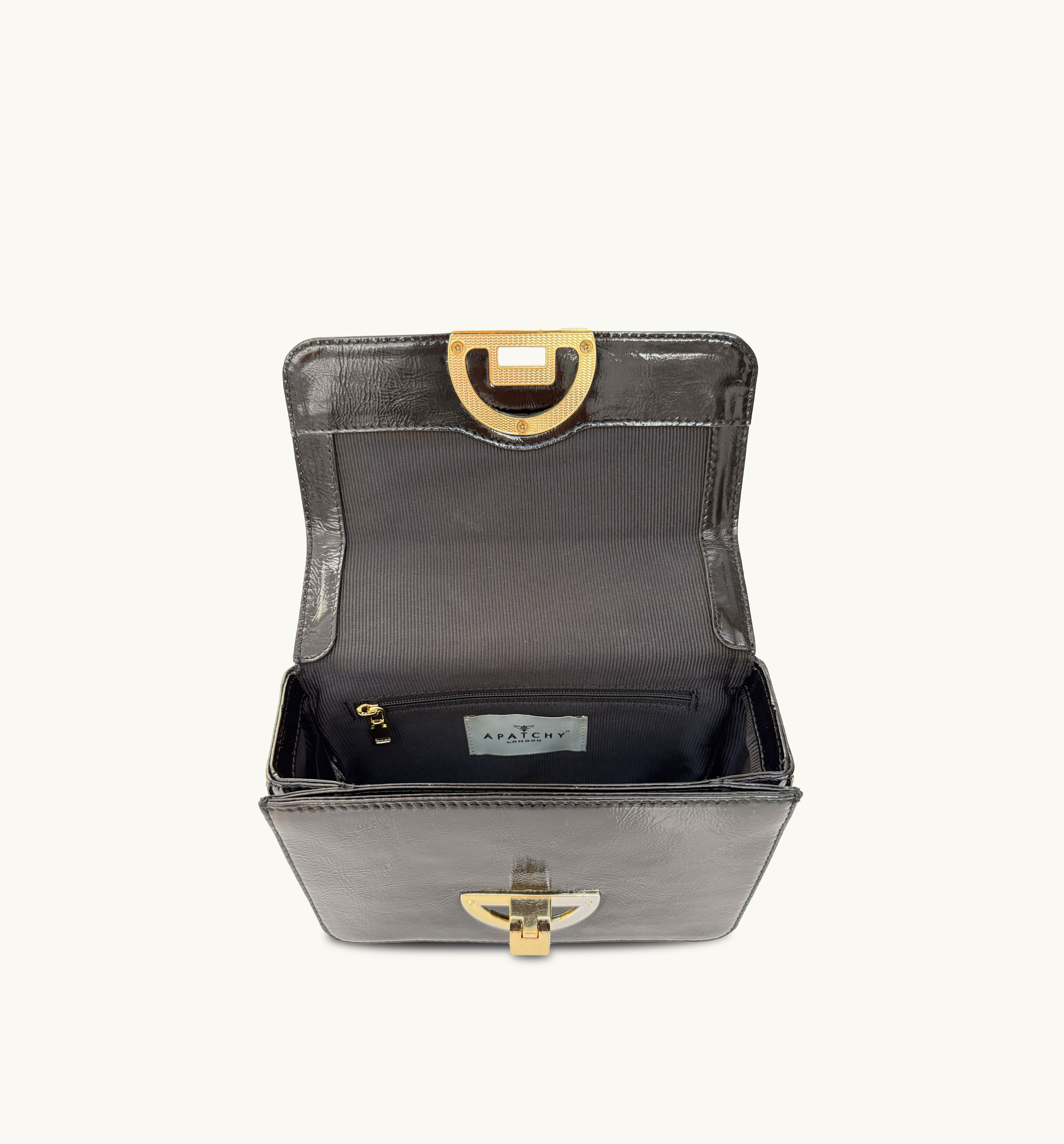- Chocolate crinkle patent leather with refined structured silhouette