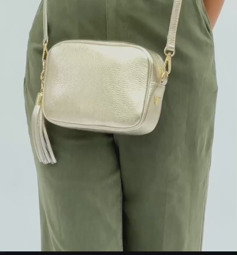 The Tassel Leather Crossbody Bag With Black & Gold Chevron Strap