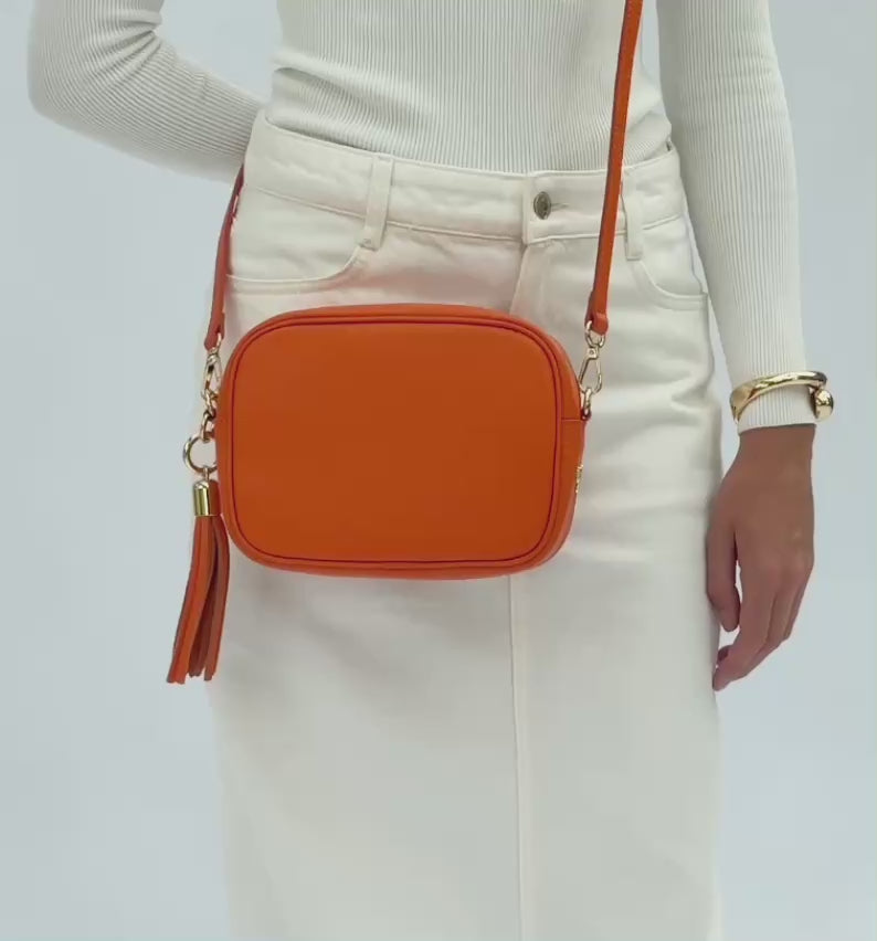 The Tassel Orange Leather Crossbody Bag With Gold Chain Strap