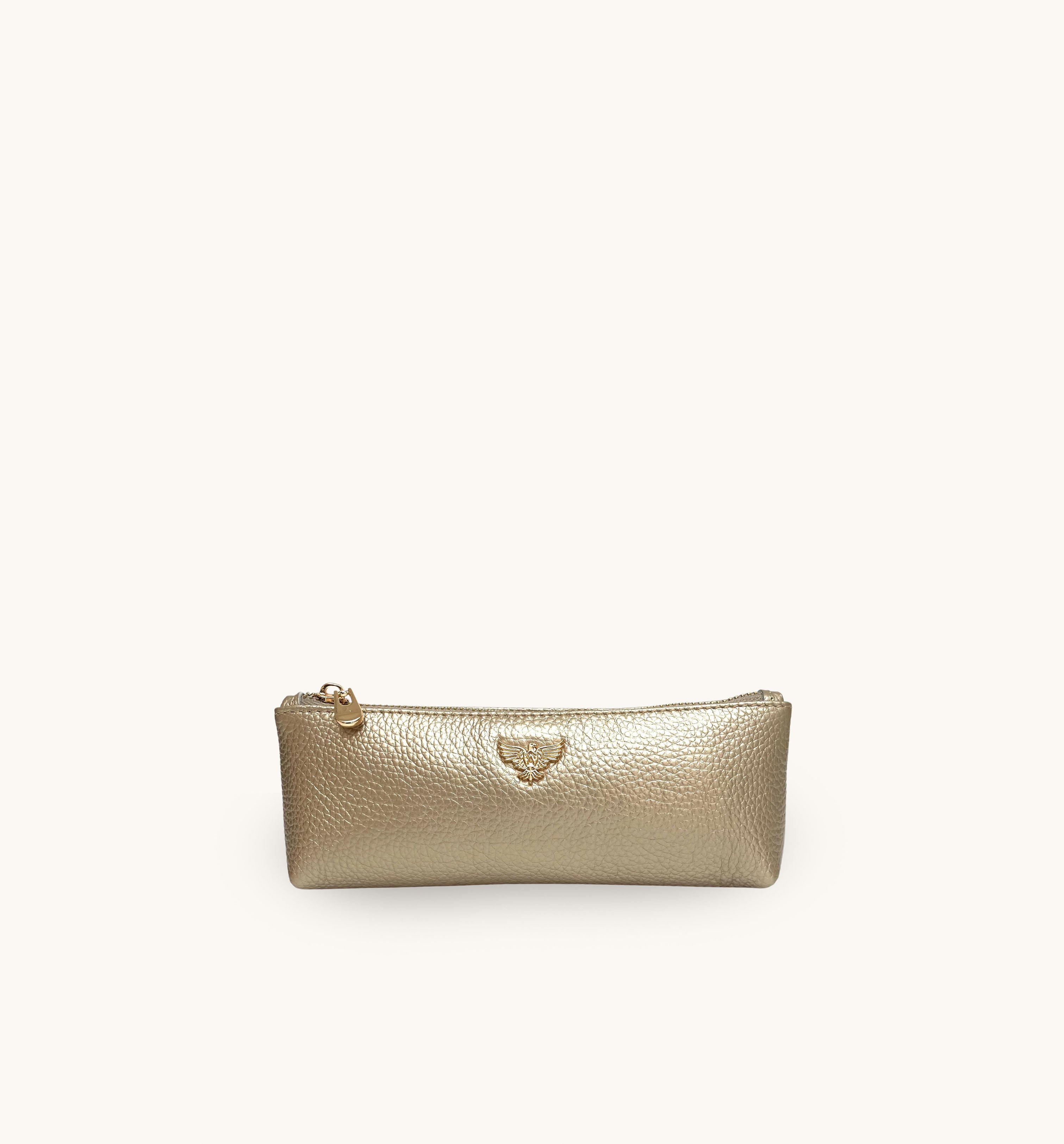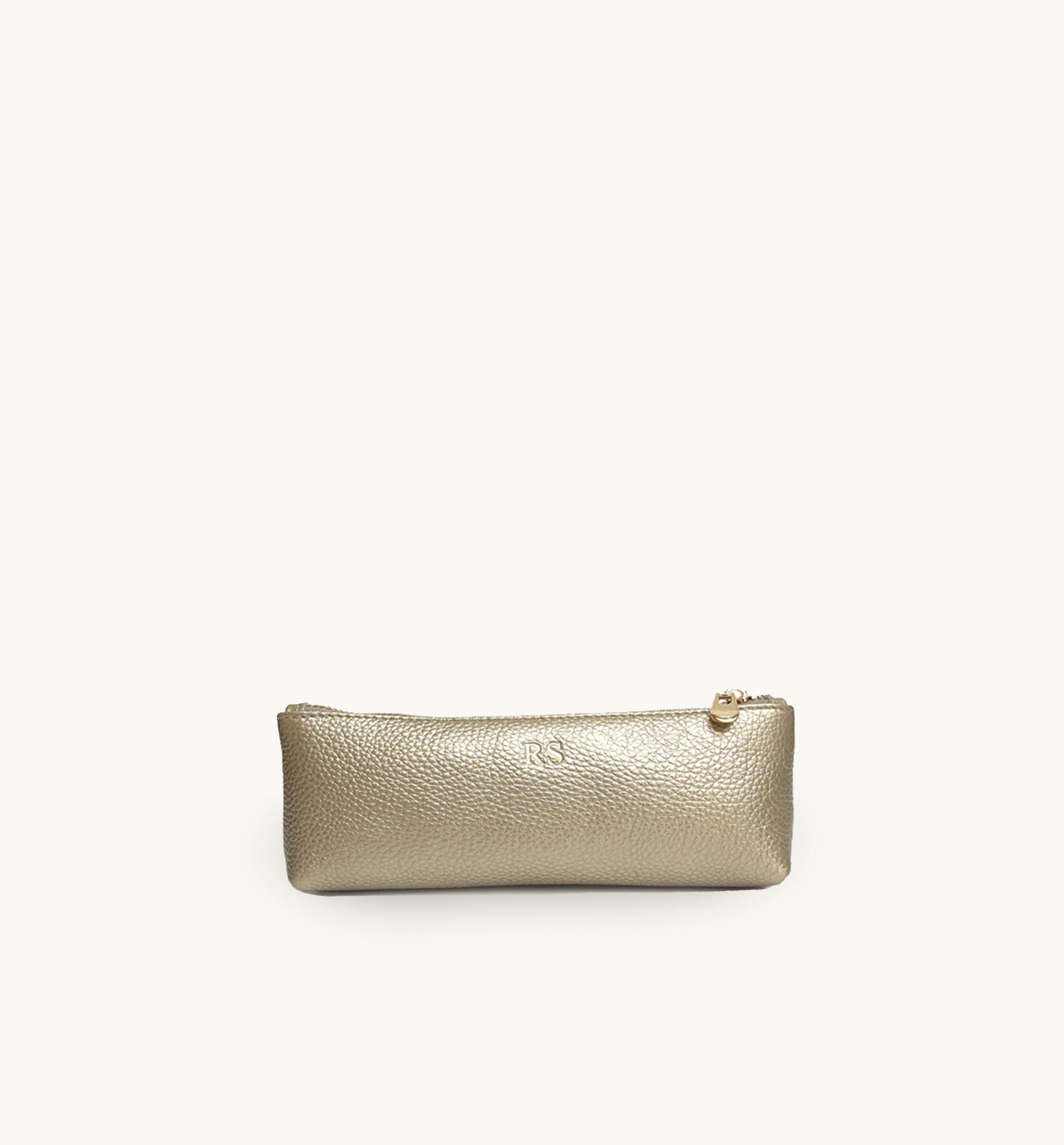 Made from grained pebble leather in Gold with gold hardware; this case is perfect for your beauty essentials, sunglasses or stationary. Small enough to fit in your handbag or suitcase, this case makes a lovely gift for you or someone special.