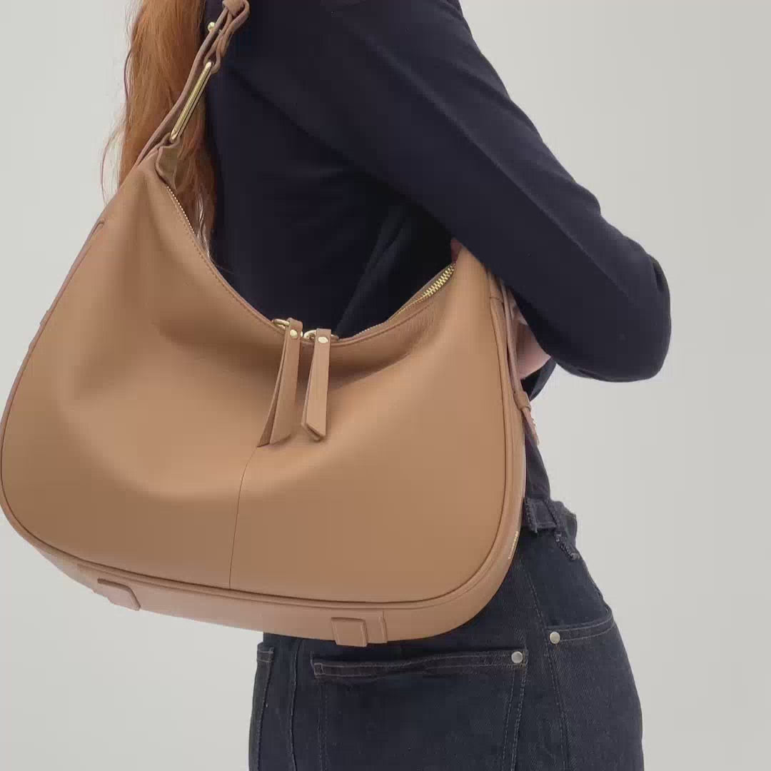 The Charlie shoulder bag is made in India. 100% leather and light gold metal hardware.