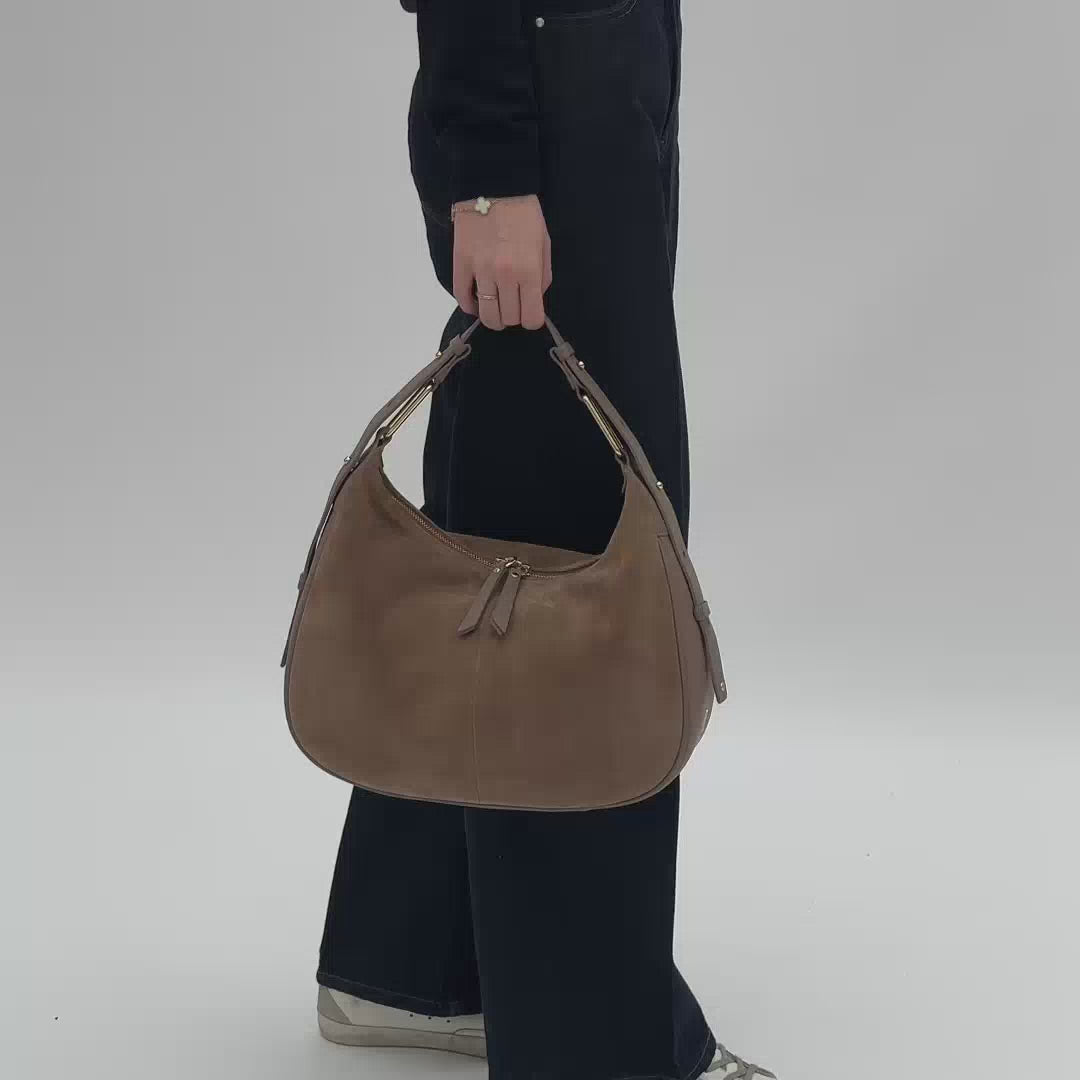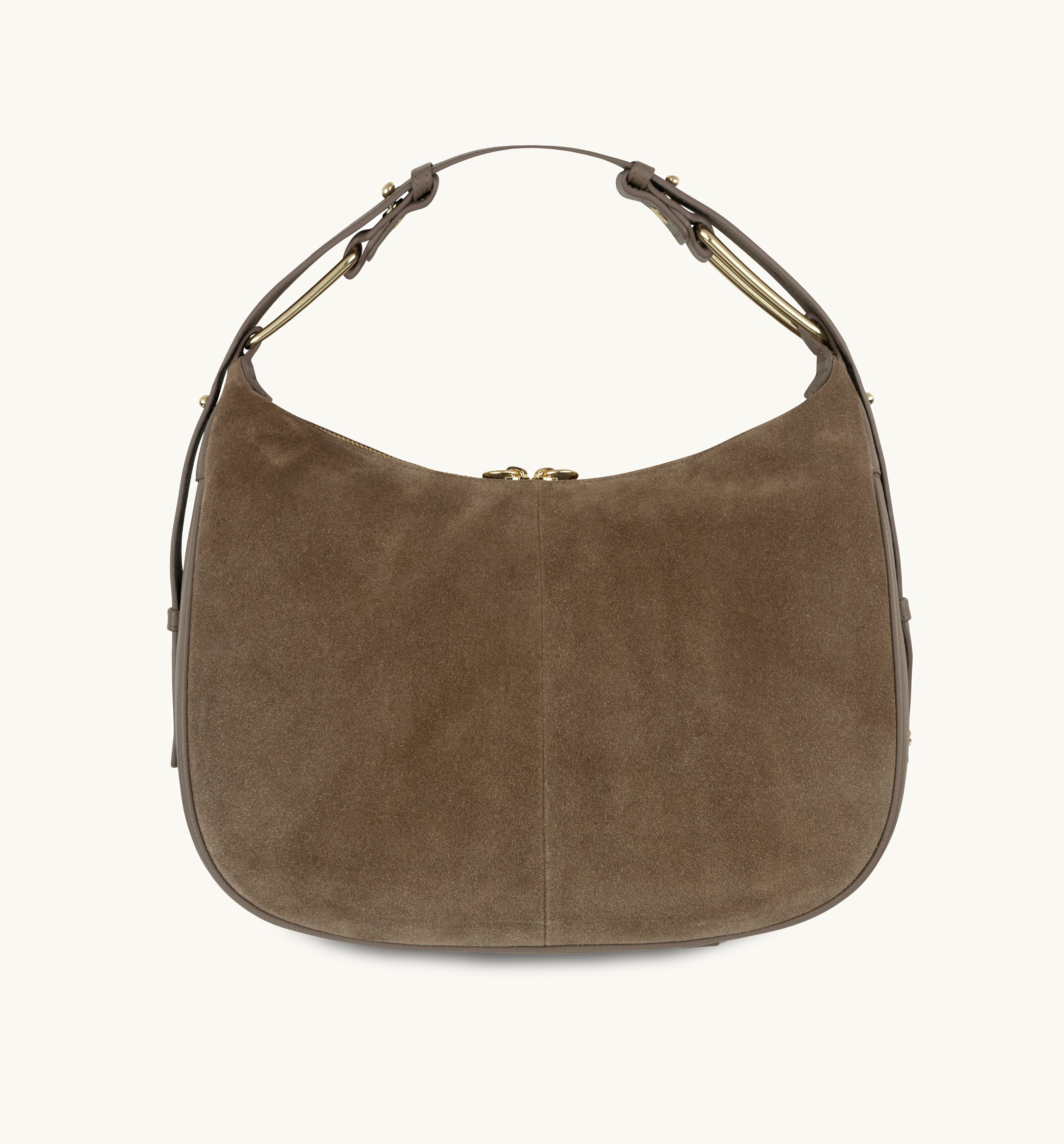 The Charlie shoulder bag is made in India. 100% Suede with leather trim and light gold metal hardware.