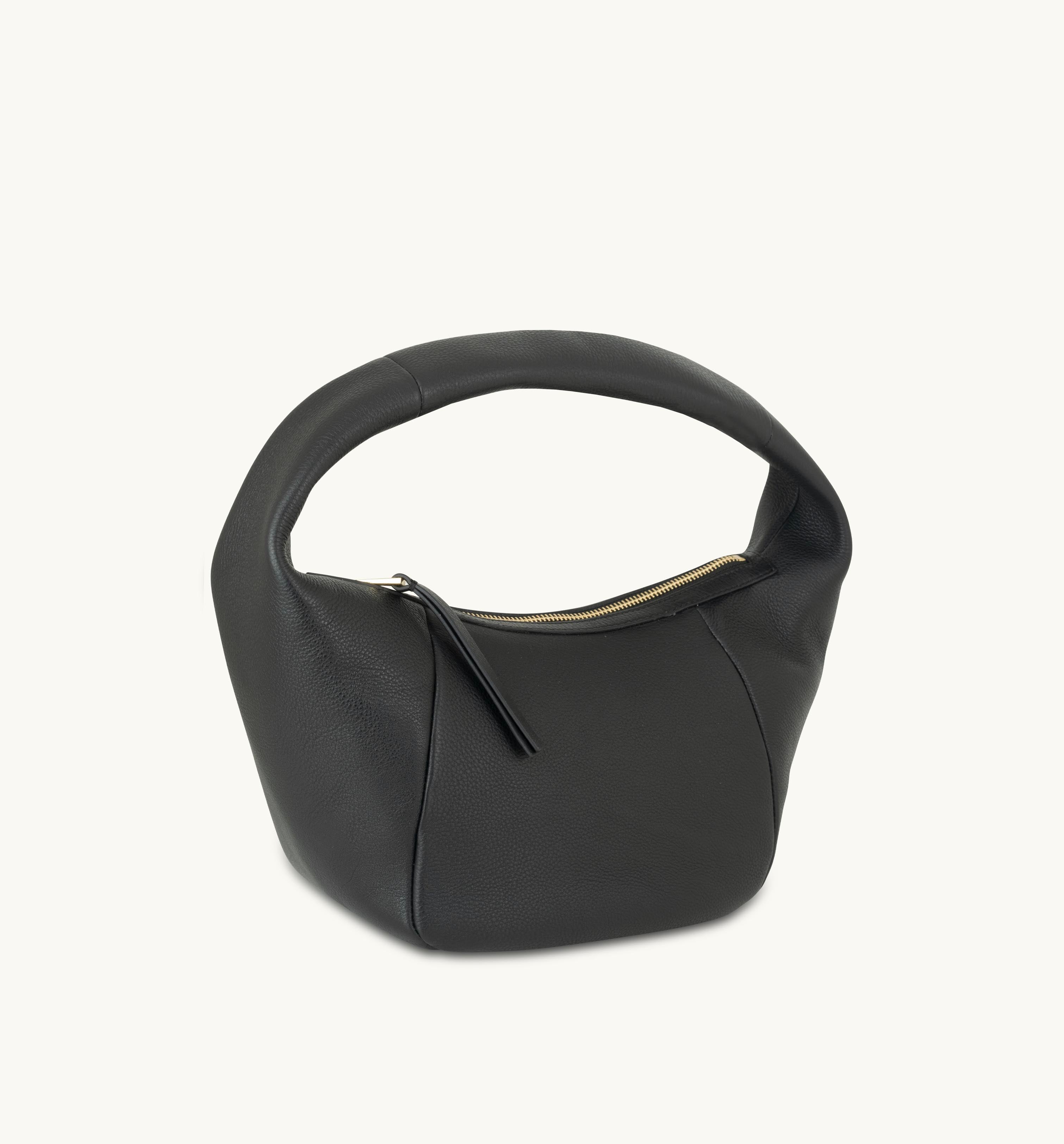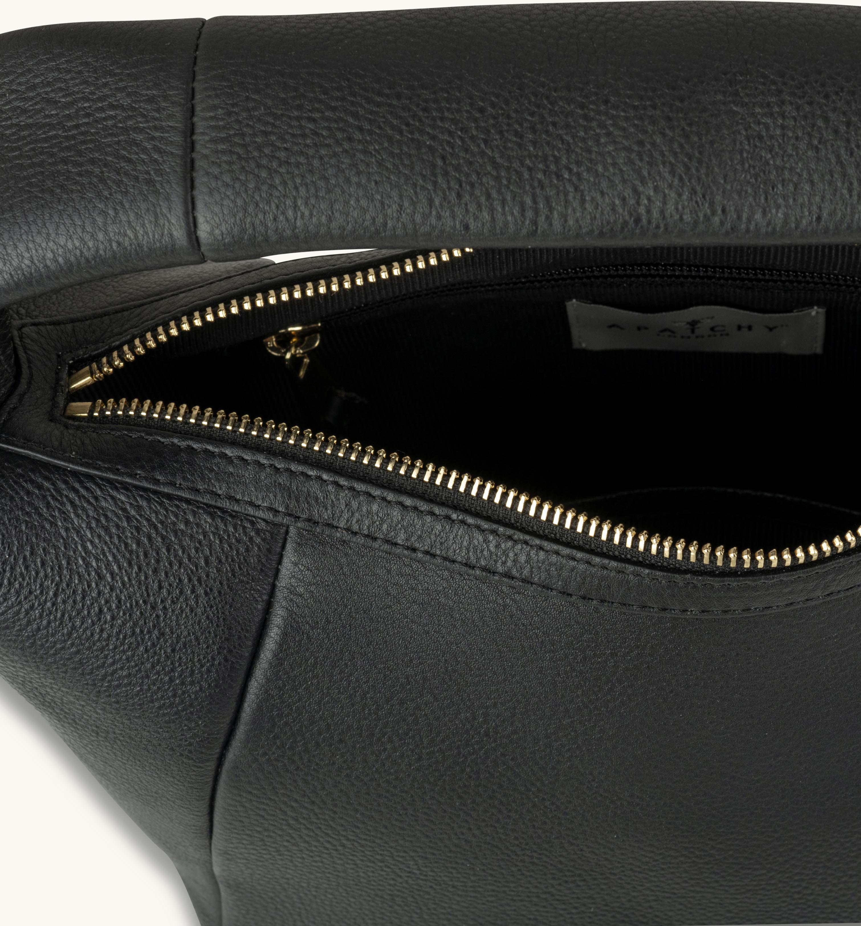 - Crafted from smooth black leather with a light gold zip fastening