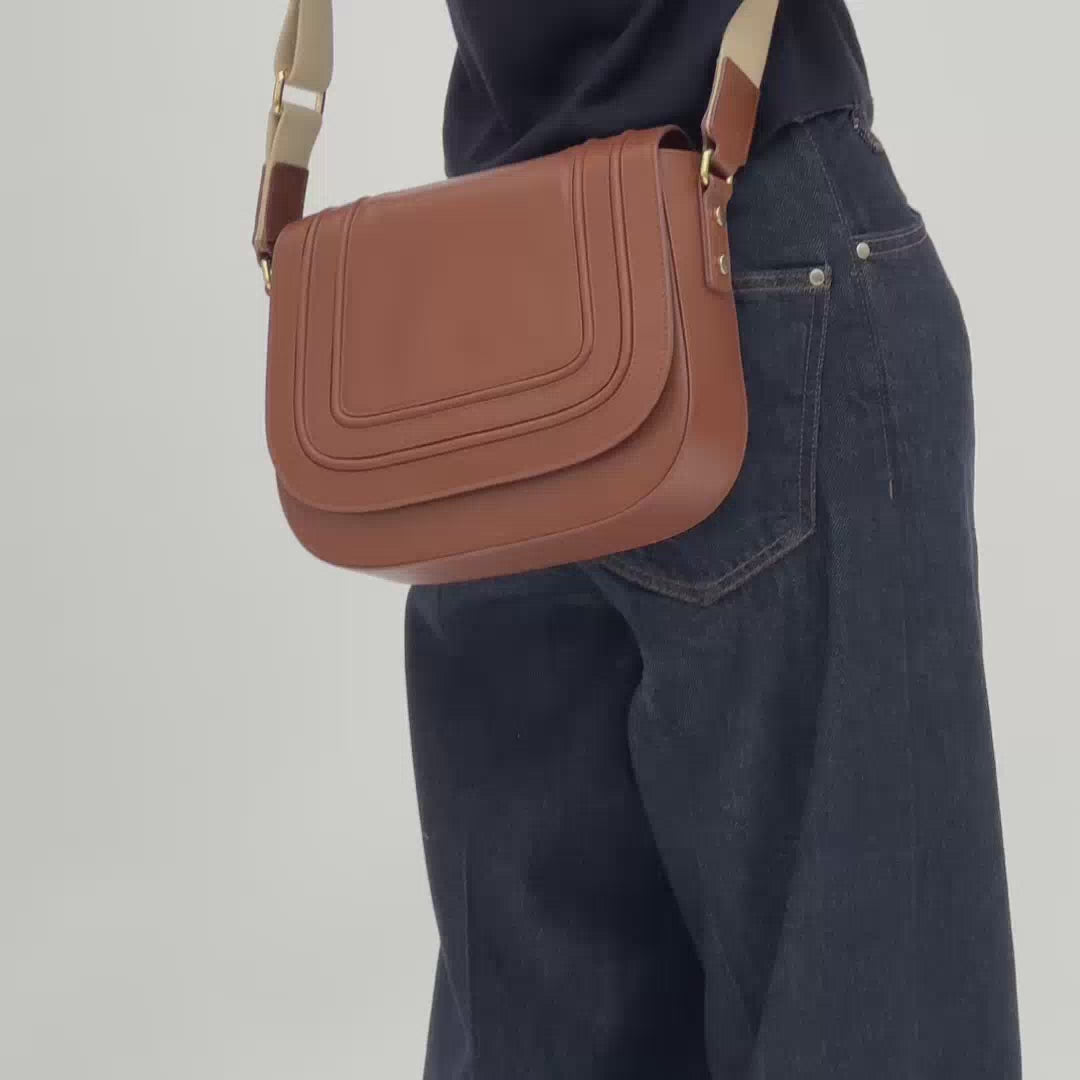 The Mimi Maxi Tan Leather Bag features clean, rounded lines with intricate saddle stitching and subtle gold stud detailing, offering a refined yet relaxed design. Its adjustable canvas strap ensures versatile and comfortable wear, making it a durable, timeless accessory that blends exceptional craftsmanship with contemporary style.