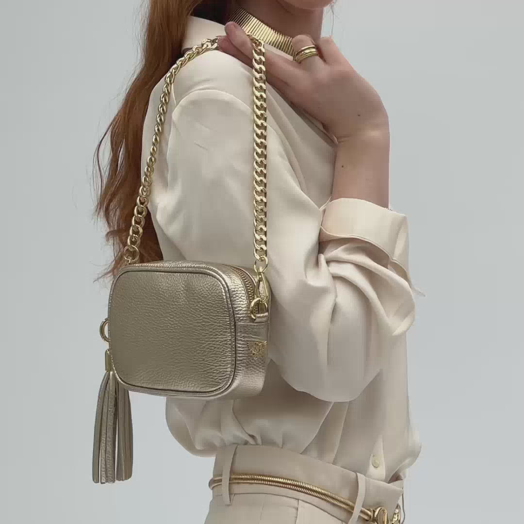Made in Italy from supple grained pebble leather, this mini handbag is fully lined and features gold hardware with a stylish leather tassel.