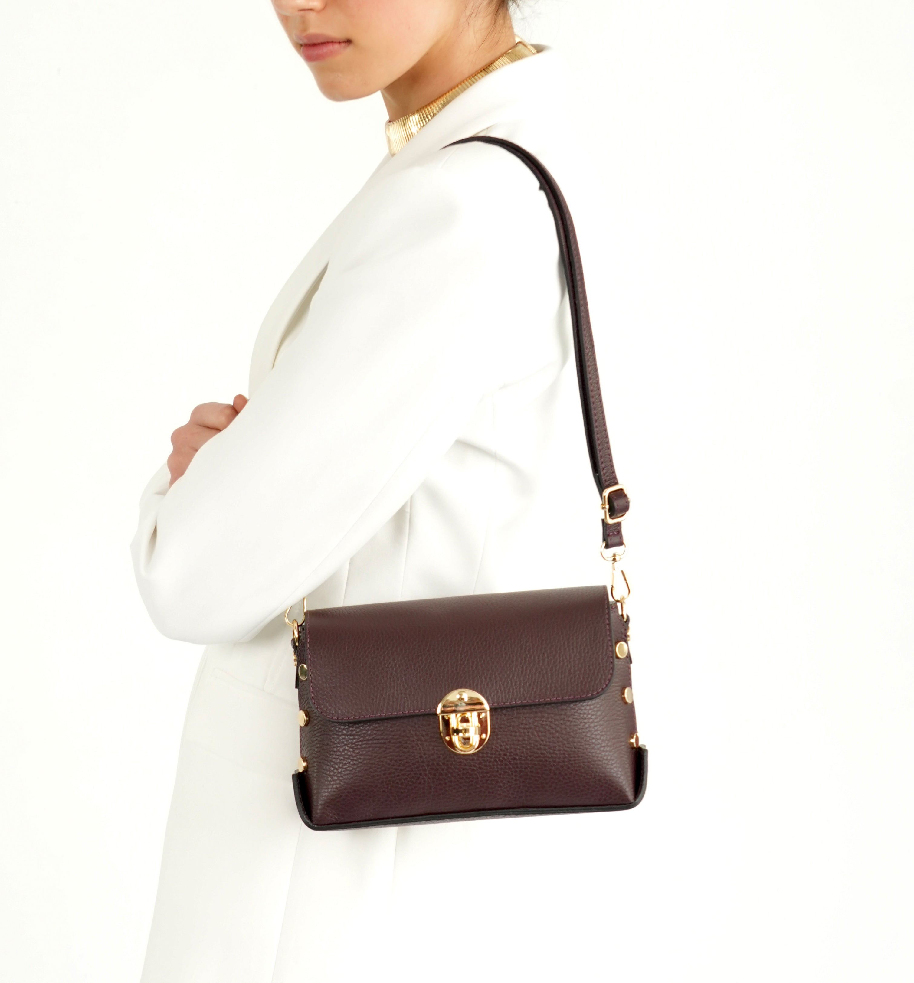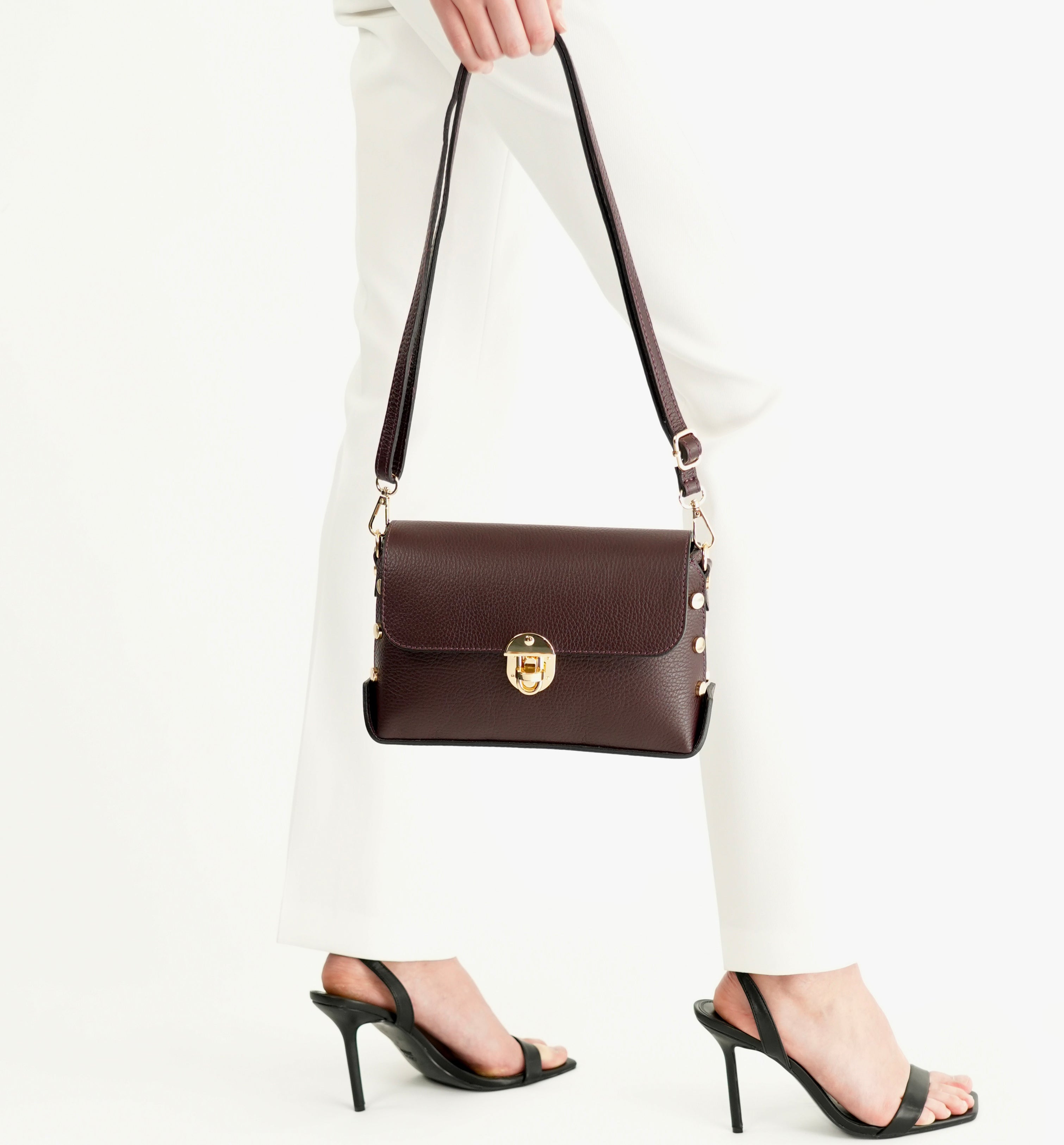 - Crafted in rich burgundy leather with chic side stud detailing